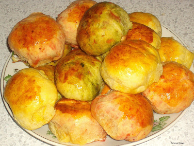 - De todas las partes de pasteles Lepim con el llenado adecuado. En caso de ser puesto en una bandeja de horno cubierta con papel de hornear, el huevo y colocarlo en el horno, precalentado a 180-200 grados. Hornee 25-35 minutos (una referencia a su horno). Sacar y dar un poco de descanso bajo una toalla.